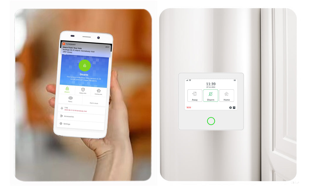 Después de activar el sensor, centro de alarma del sistema de alarma con módulos WLAN / SIM envía notificaciones push a la aplicación y envía mensajes de texto o llamar números de teléfono preestablecidos. Puedes configurar el método de alarma en la aplicación.